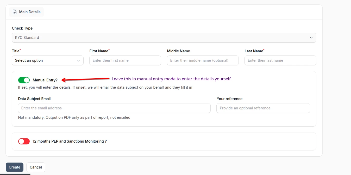If you are carrying out a KYC Standard, you will see an option for Manual Entry. This is set to On by default allowing you to enter the details just like the old system. If you set it to off then we will be sending an email to the data subject advising that your company is asking them to enter the details for an ID Check. If you are in Manual Entry mode, then the email is no longer mandatory, however if you include it, it will be output on the PDF report so that you have a reference to their email on the report itself.