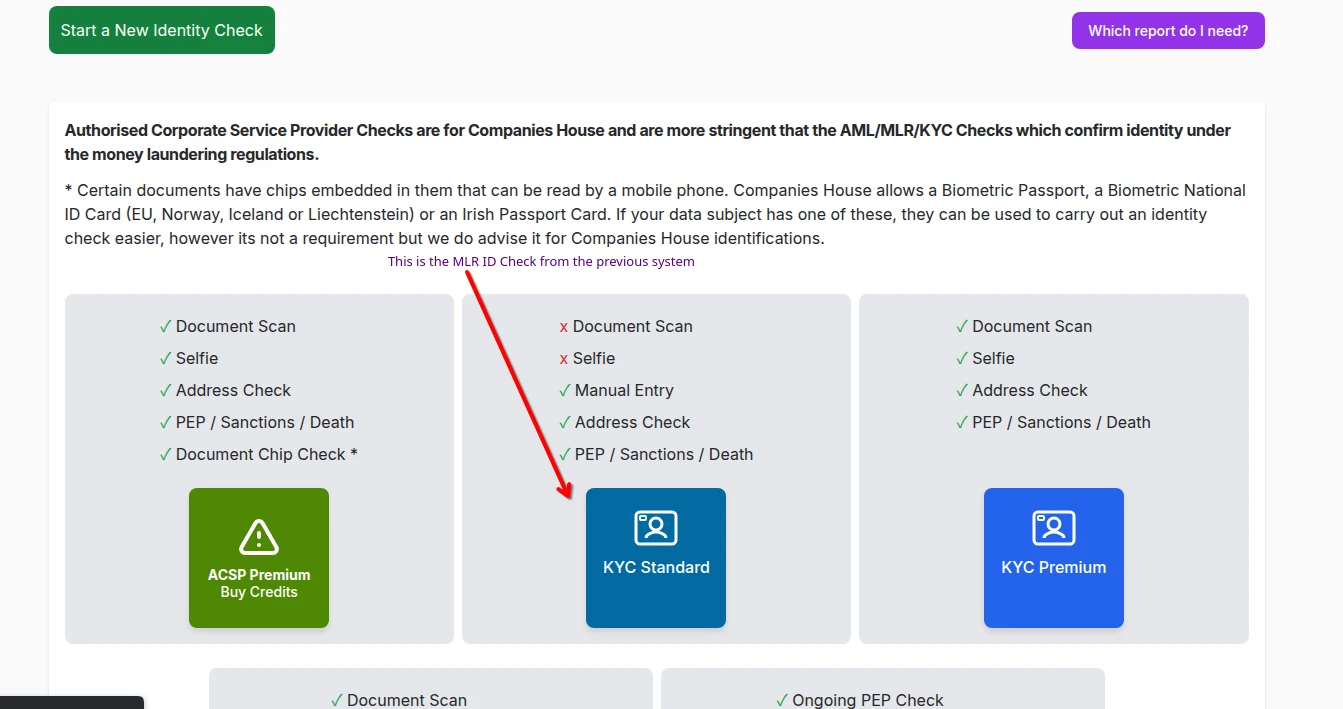 In order to replicate the same system that you are used to, when you choose to start a new check, choose the KYC Standard option.